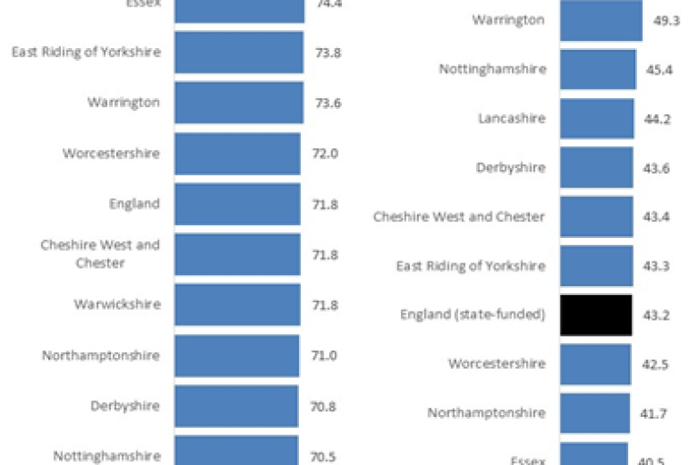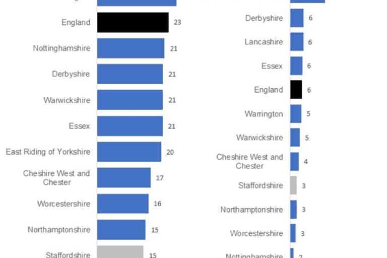 - However, performance falls by year 11, with Staffordshire’s attainment lower than national and the lowest among similar authorities – only 37% achieve a 9-5 pass in English and Maths.